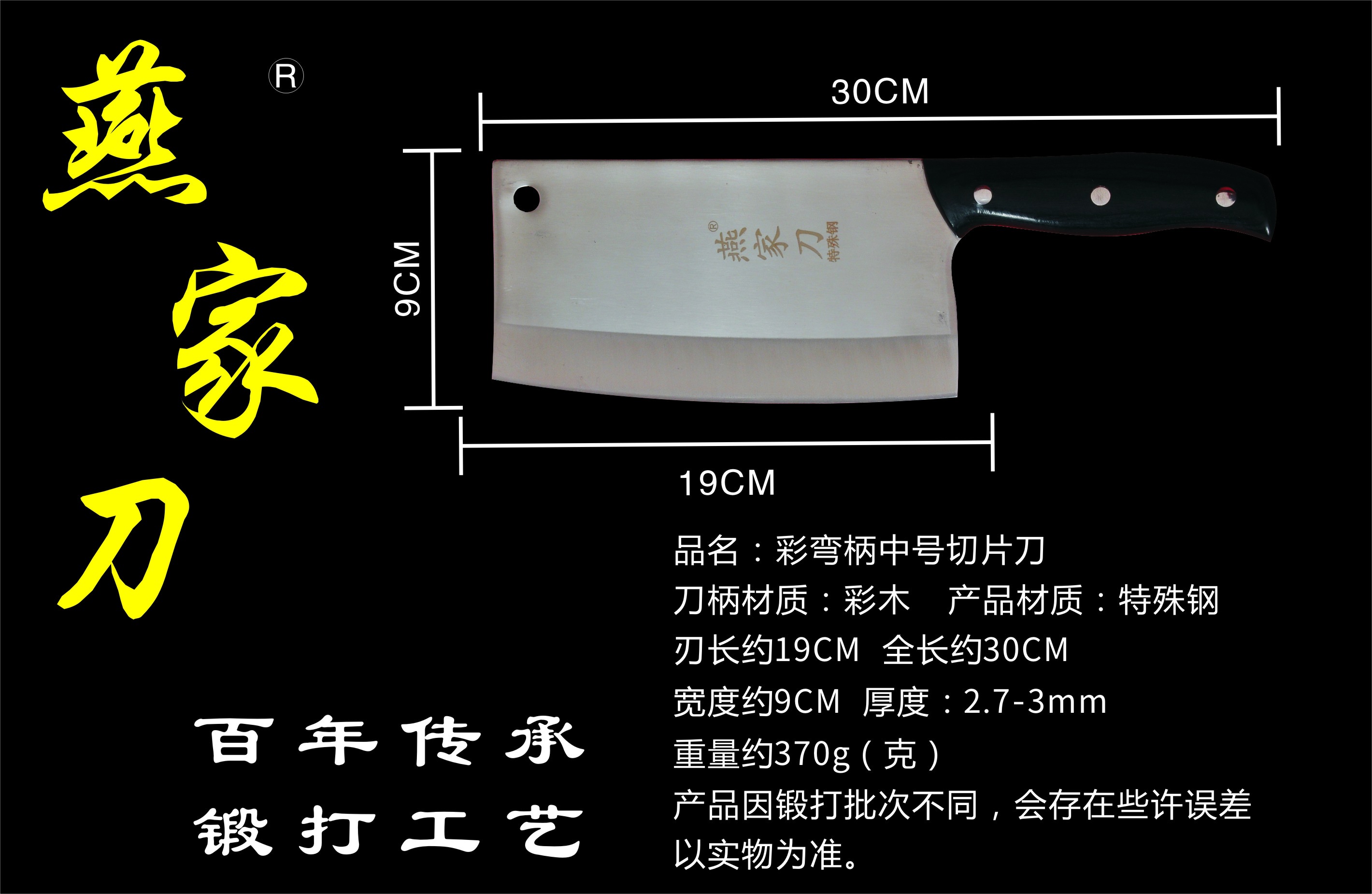 樂山燕家刀具有限公司(公司前身為燕佳鐵匠鋪),公司坐落于美麗的佛都之鄉(xiāng)樂山嘉州,在全國各地有上千家代理經(jīng)銷點,公司專業(yè)銷售、設計、制作各類刀具。秉承一貫鍛造三精要求,即選料精、用料精、工藝精。所選材料全部產(chǎn)自滇東鐵礦優(yōu)產(chǎn)區(qū)。本品牌刀具堅持千挑萬選為材,千錘百煉為刀的手工鍛造工藝宗旨。具有鋒利耐磨、持久耐用,用料上乘,硬度高、韌度強的特點!